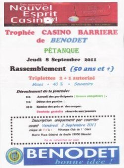 Le Pétanque Club de l'Odet organise le Jeudi 8 Septembre 2011 à 09H00 au Complexe Sportif de Bénodet, le trophée Casino Barrière, réservé aux licenciés de 50 ans et plus , en triplettes (2+1 autorisé).