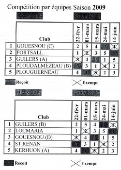 Compétitions par équipes Saison 2009 Deux équipes engagées cette année DIV 3 / POULE 1 GOUESNOU (C) PORTSALL GUILERS (A) PLOUDALMEZEAU (B) PLOUGUERNEAU DIV 3 / POULE 2 GUILERS (B) LOCMARIA GOUESNOU (D) ST RENAN KERHUON (A)