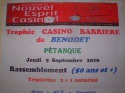 Le Trophée de pétanque CASINO BARRIERE de BENODET, (50 ans et +) se déroulera le Jeudi 9 Septembre 2010 au Complexe Sportif de Bénodet.