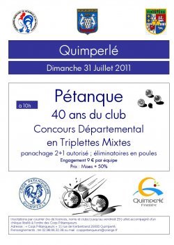 QUIMPERLE DIMANCHE 31 JUILLET 2011 CONCOURS DEPARTEMENTAL EN TRIPLETTES MIXTES PANACHAGE 2+1 AUTORISE ELIMINATOIRES EN POULES ENGAGEMENT : 9 EUROS PAR EQUIPE PRIX : MISES + 50 % (VOIR AFFICHE CI-DESSOUS EN FICHIER PDF)