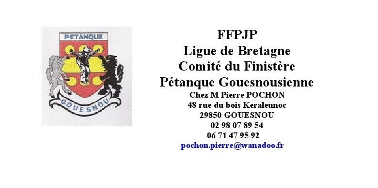 Les inscriptions devront parvenir, uniquement par courrier, sur feuilles d'engagement dûment remplies (clubs, noms, prénoms, n° de licence) pour le mercredi 10 avril 2013 dernier délai, accompagnées d'un chèque (9 €/équipe) à l'ordre du club de la Pétanque Gouesnousienne à l'adresse suivante :