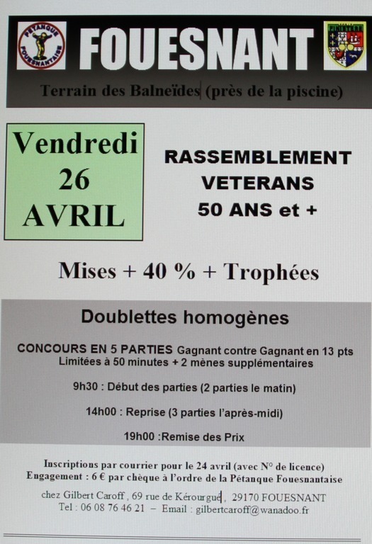 En doublettes homogènes, sur le terrain des Balneïdes (près de la piscine), le vendredi 26 AVRIL, La Pétanque Fouesnantaise organise son Rassemblement Vétérans (Mises + 40 % + Trophées) Le concours se déroulera en 5 PARTIES, Gagnant contre Gagnant en 13 pts Limitées à 50 minutes + 2 mènes supplémentaires