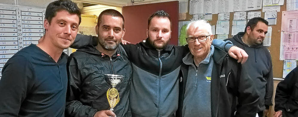 À Pen ar C'Hoat, vendredi, l'ASG football organisait, en semi-nocturne, son annuel concours de pétanque, qui a vu 30 doublettes s'affronter lors de parties âprement disputées, le tout dans une excellente ambiance et un bel esprit sportif. La doublette composée de Vivien et Nico s'est adjugée la victoire devant Christophe et Bruno, deuxièmes ; Moutinho et Mota, 3e ; Titou et Jean-Marie, 4e ; Claude et Jean-Michel se classent cinquièmes. (De gauche à droite : Florian Cléret, président de l'ASG, les vainqueurs Vivien et Nico, et Michel Kereneur, bénévole au club)