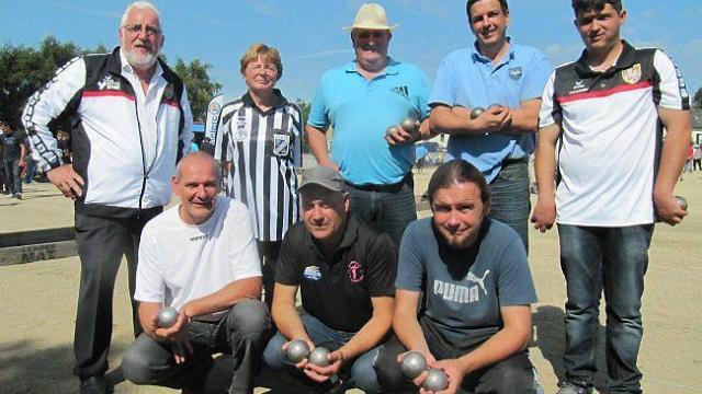 PHOTO : L'équipe du Pétanque-club clédérois debout à droite avec une équipe de Plougastel-Daoulas en compagnie de Bertrand Le Guen du comité départemental et de Marie-Paule Guéguen arbitre.